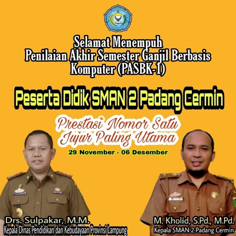 Meskipun dalam masa pandemi Covid-19, SMAN 2 Padang Cermin melaksanakan Penialian Akhir Semester Ganjil TP. 2021-2022 dengan mode Luring dan Daring dan dengan pola on/off. Sejak dimulainya PASBK-1 pada tanggal 29 November 2021 sampai dengan nanti tanggal 6 Desember 2021, PASBK-1 berjalan dengan lancar, aman, tertib, dan terkendali.
