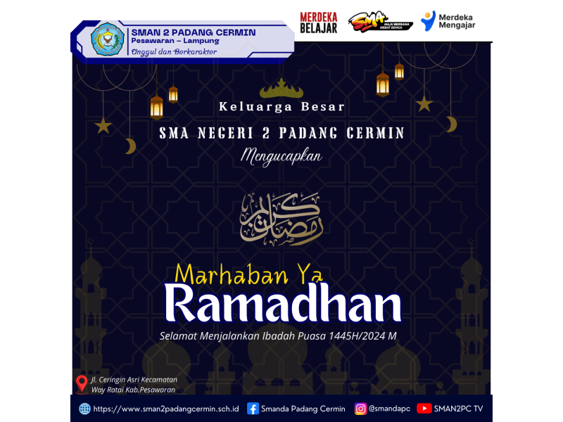 KELUARGA BESAR SMA N 2 PADANG CERMIN MENGUCAPKAN"SELAMAT MENJALANKAN IBADAH PUASA 1445H/2024M"مَنْ صَامَ رَمَضَانَ إِيمَانًا وَاحْتِسَابًا غُفِرَ لَهُ مَا تَقَدَّمَ مِنْ ذَنْبِهِ"Barang siapa yang berpuasa dibulan Ramadhan karena iman dan mengharap pahala dari Allah, maka diampuni dosanya yang telah berlalu....