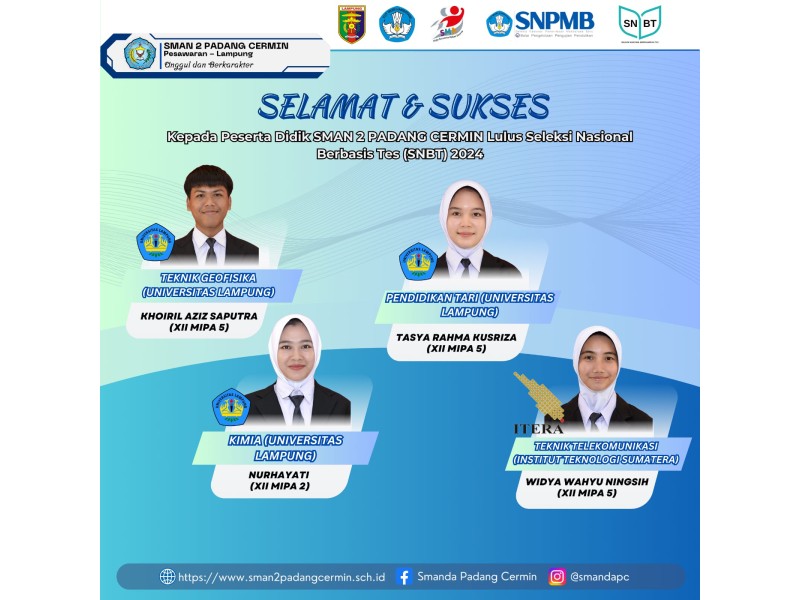 SELAMAT DAN SUKSES KEPADA SISWA SISWI SMAN 2 PADANG CERMINKeluarga Besar SMAN2 PADANG CERMIN mengucapkan Selamat Dan Sukses kepada siswa siswi SMAN 2 PADANG CERMIN atas diterimanya di perguruan tinggi melalui jalur SNBT Tahun 2024“Selamat dan sukses untuk tahap baru...